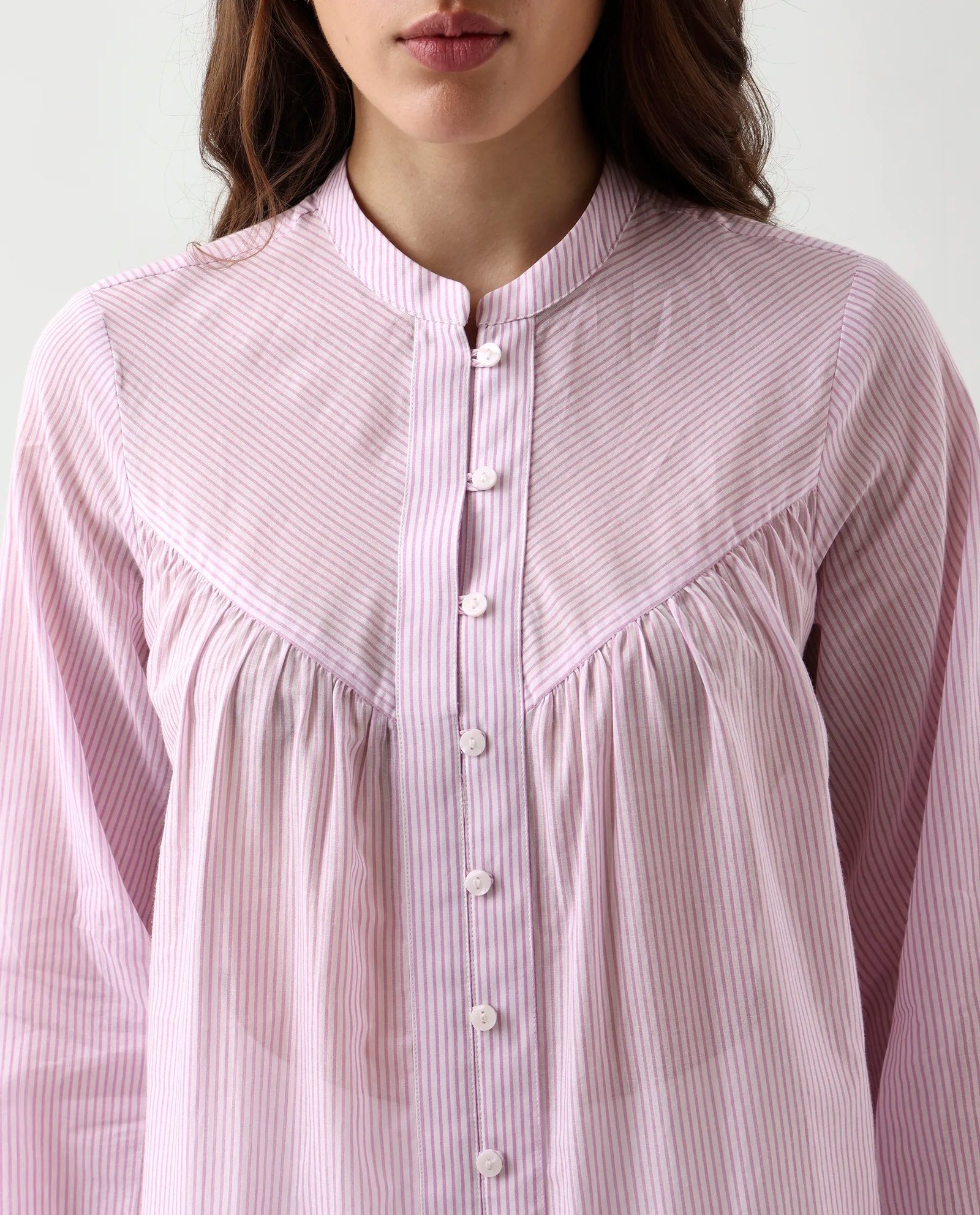 Elevate your wardrobe with the Rareism Women Nubelo Purple Mandarin Collar Button Closure Striped Top. Featuring a sleek mandarin collar and a refined button closure. this top combines classic structure with modern style. The subtle striped pattern adds visual interest while maintaining a professional and polished look. making it ideal for both office wear and casual outings. Crafted for comfort and versatility. it pairs effortlessly with tailored pants or skirts for a sophisticated ensemble.